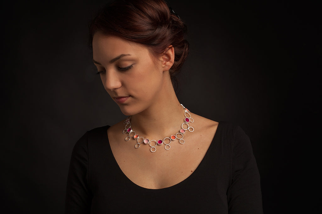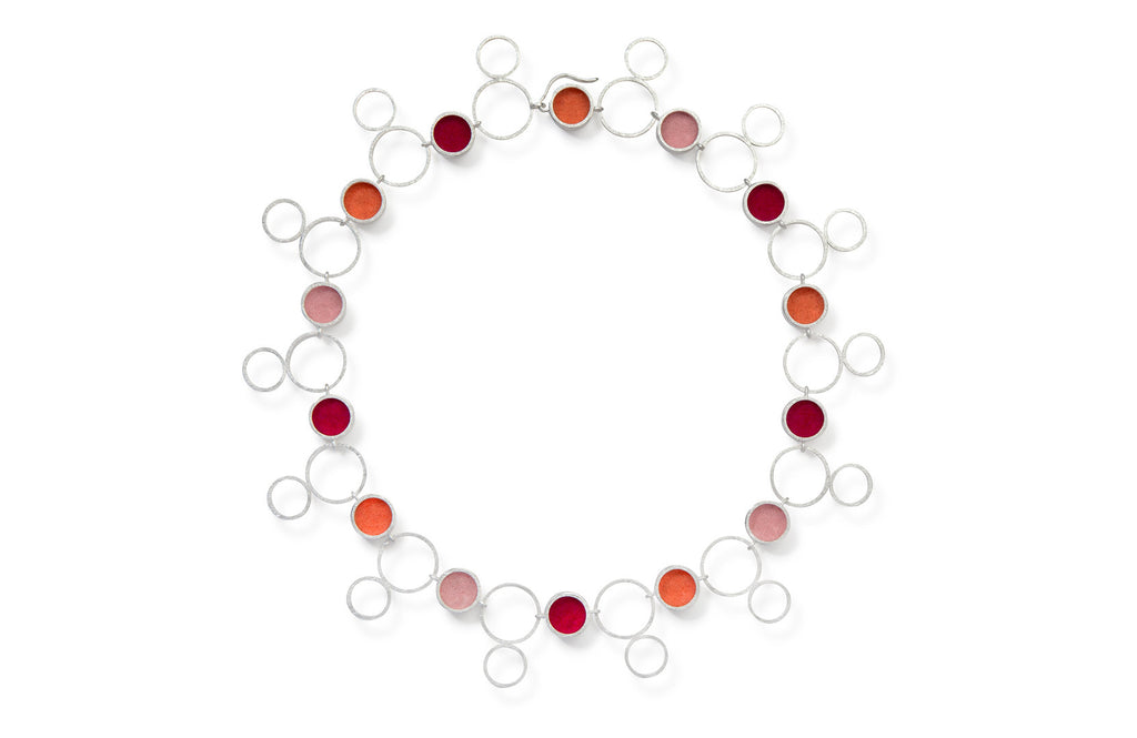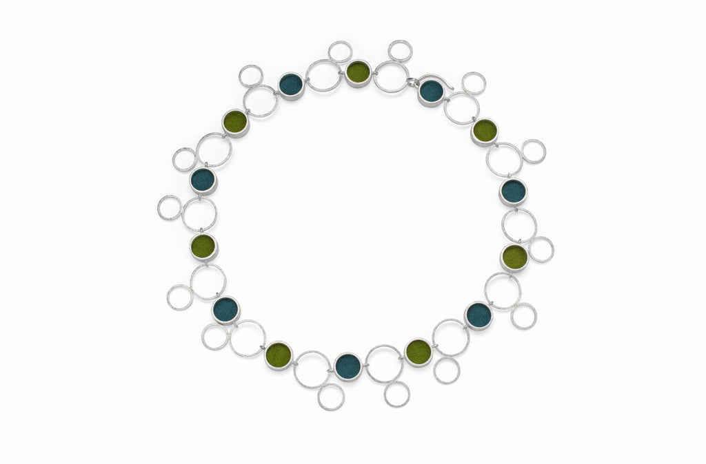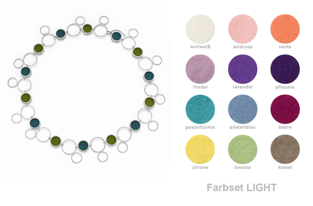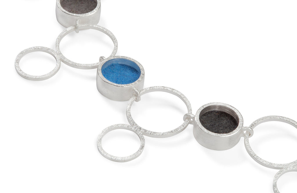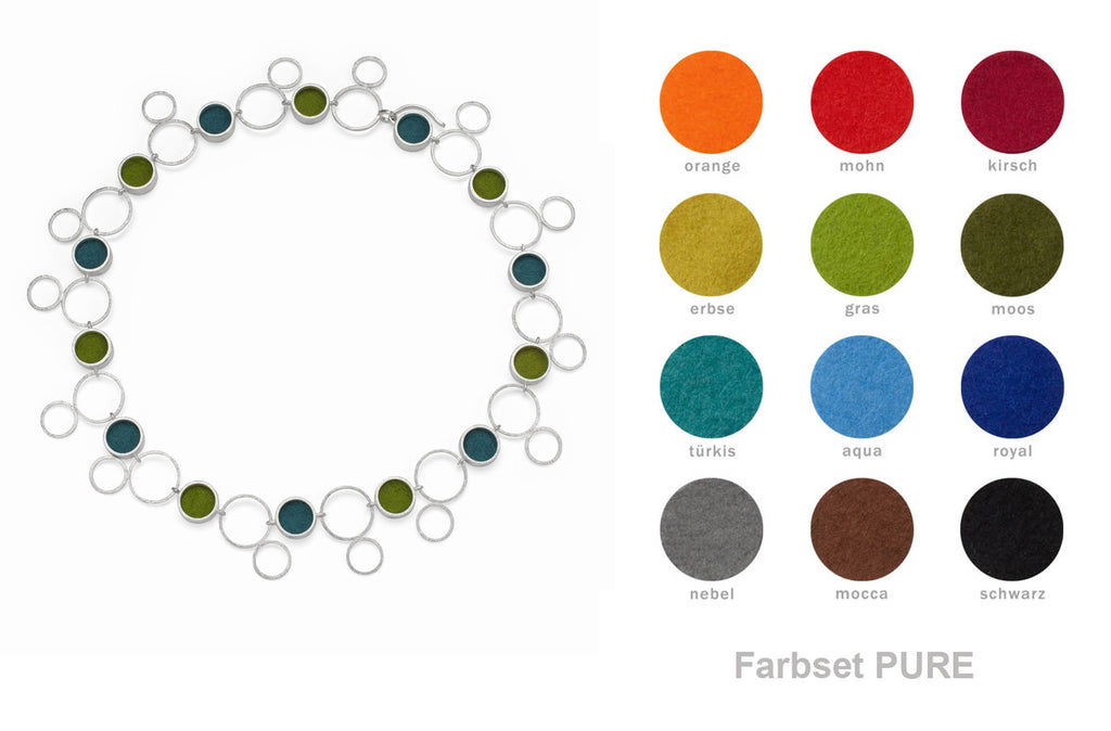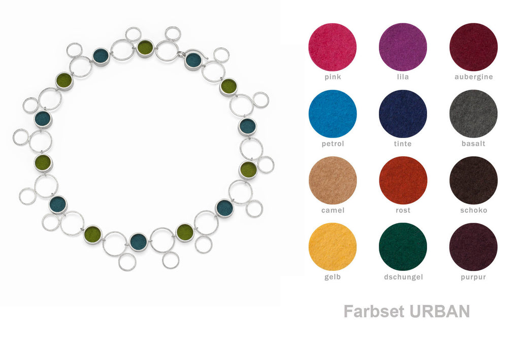 Ausdrucksstark und unübersehbar - dieses Collier mit auswechselbaren Filzinlays schmückt Sie für besondere Anlässe oder lässt Ihren Alltag zu etwas ganz Besonderem werden. Die Doppelösen sind beweglich und lockern die strenge Anordnung der Filzfassungen auf. Der unaufällig integrierte Verschluss ist einfach in seiner Handhabung.