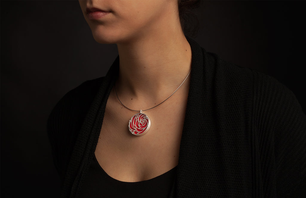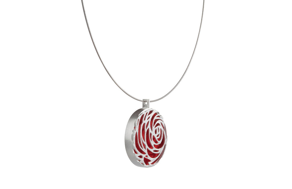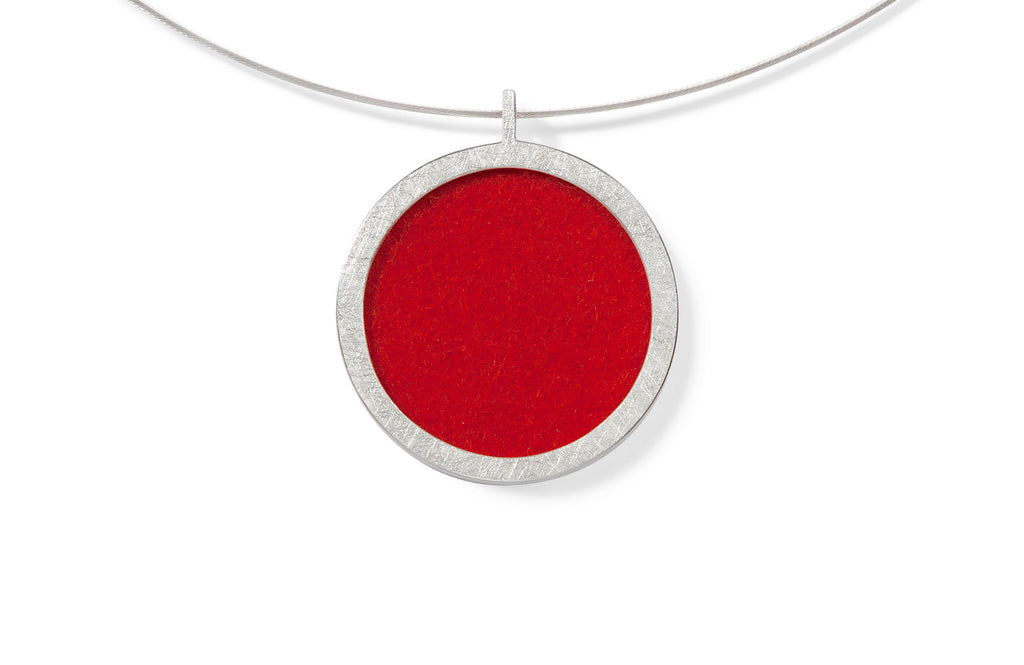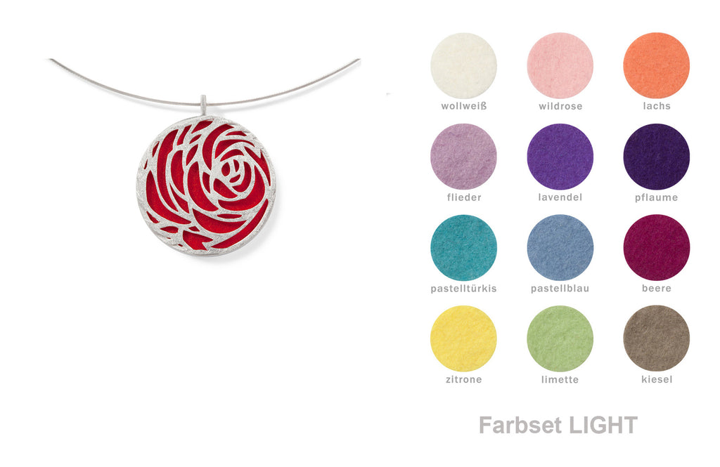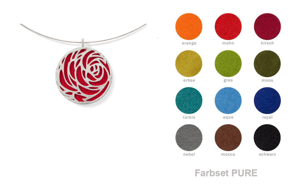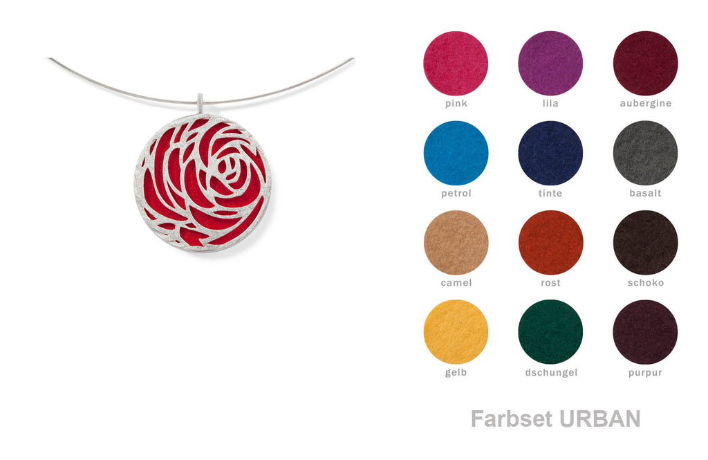 Die geometrische Außenform dieses Schmuckstückes vereint sich wunderbar harmonisch mit der ornamentalen Blütendarstellung. Auch die andere Seite des Anhängers kann sich sehen lassen: Hier zeigt sich die ganze Farbpracht des jeweiligen Filzes, den die Trägerin jeden Tag aufs Neue wählen kann.