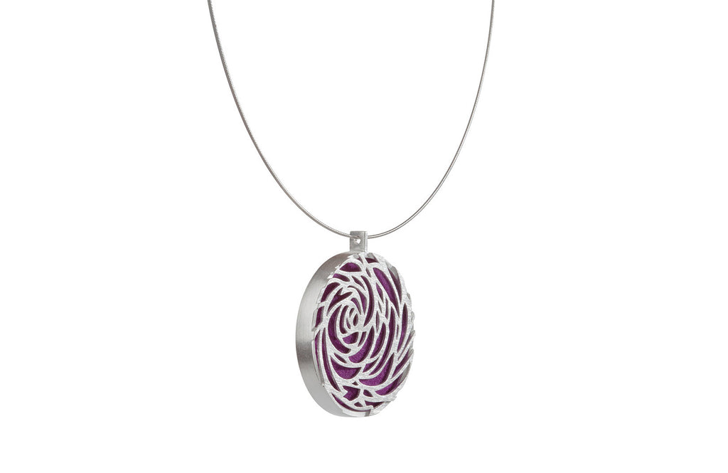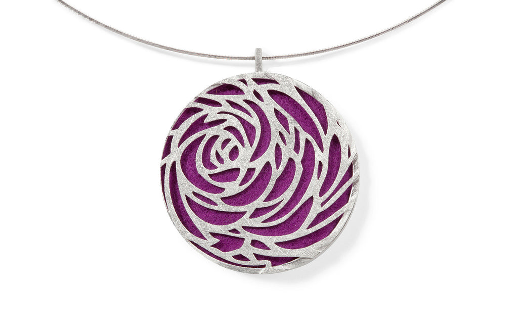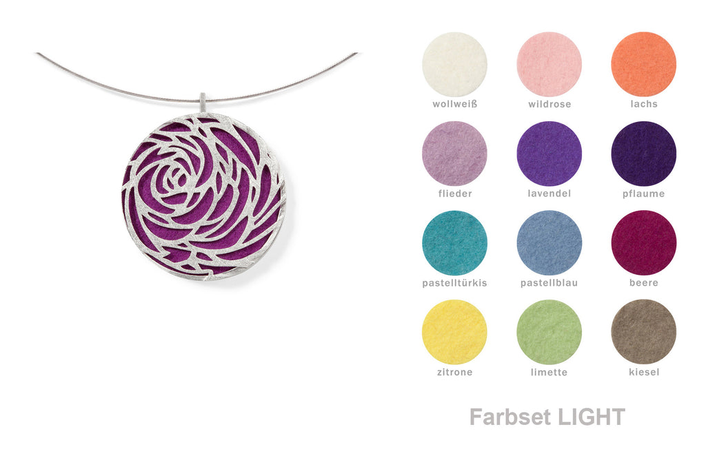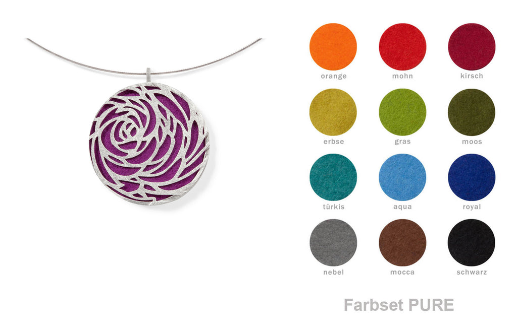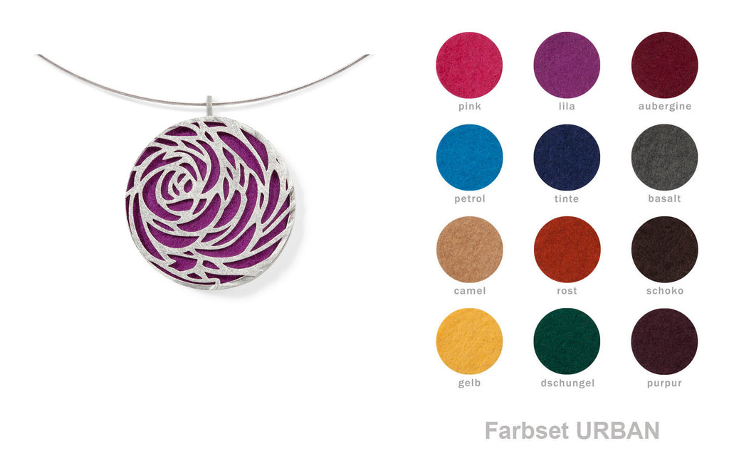 Ein prachtvolles Schmuckstück! Das filigran gearbeitete florale Muster, die durchblitzende leuchtende Filzfarbe und die klare Außenform sind in der großen Variante ein wahrer Hingucker. 12 auswechselbare Farben und die Möglichkeit, den Anhänger von zwei Seiten zu tragen sorgen dafür, dass es mit diesem Schmuckstück immer spannend bleibt.