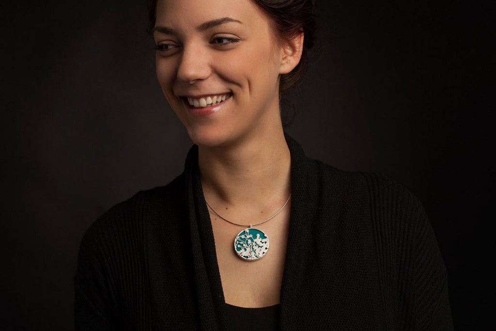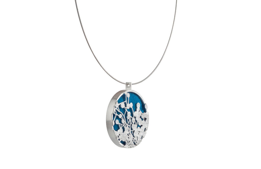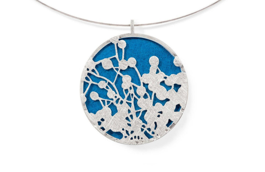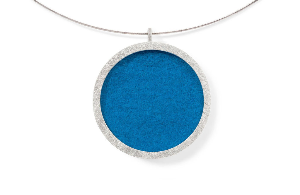 Ein Kettenanhänger mit großer Wirkung! Beide Seiten sind eindrucksvoll, sowohl das Muster als auch die monochrome Seite, die den auswechselbaren Filz in seiner ganzen Farbpracht zeigt.