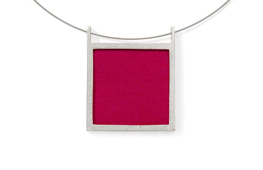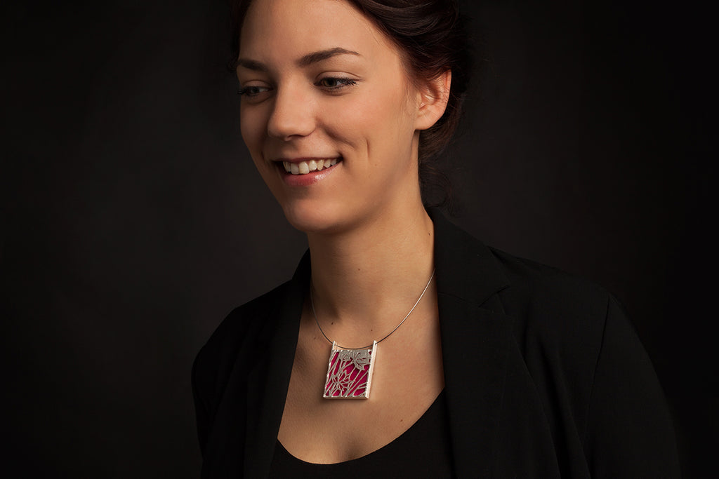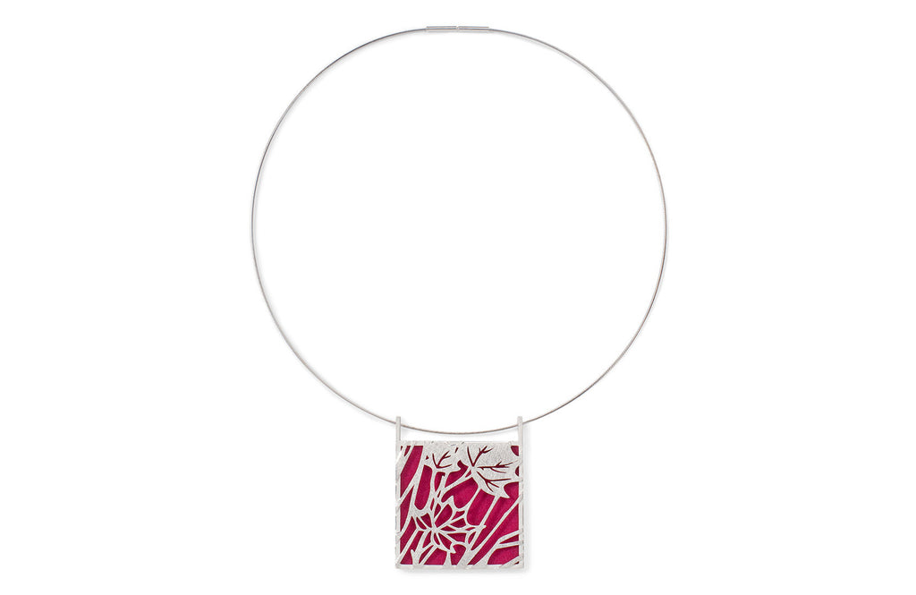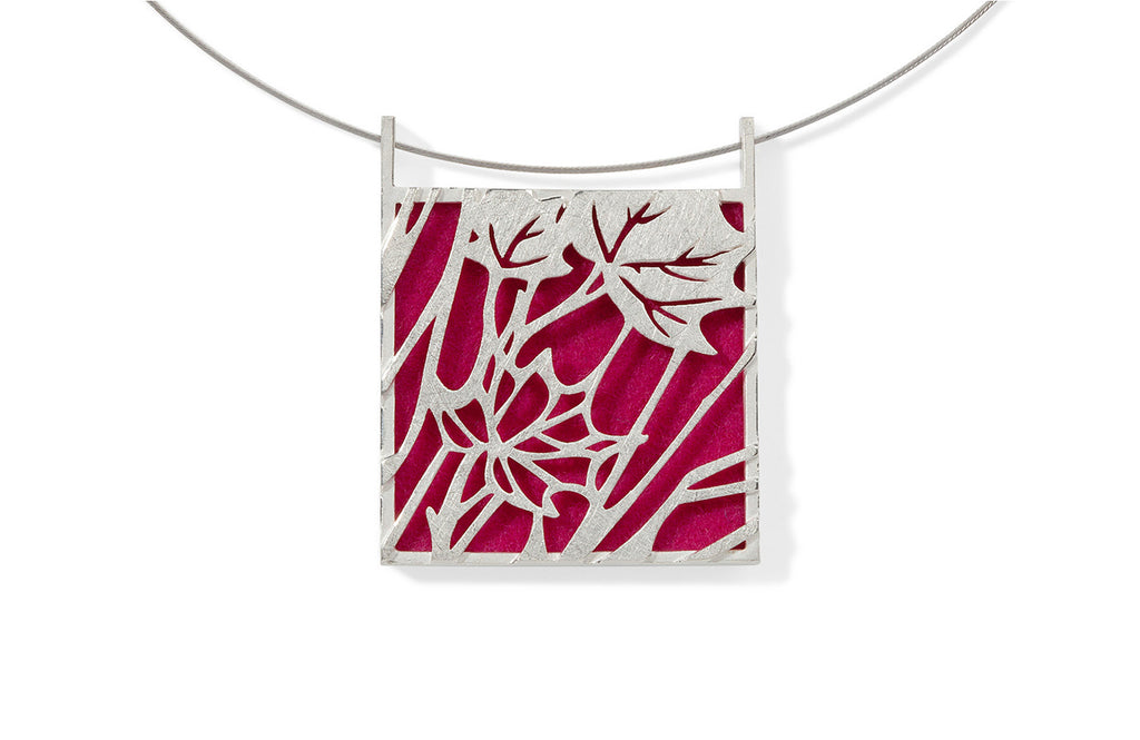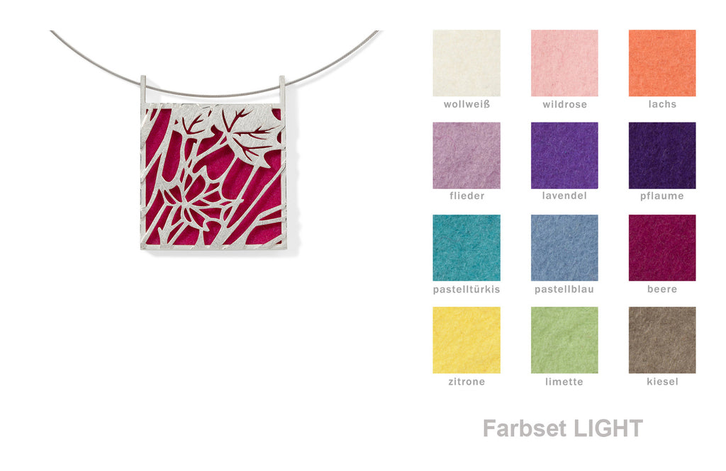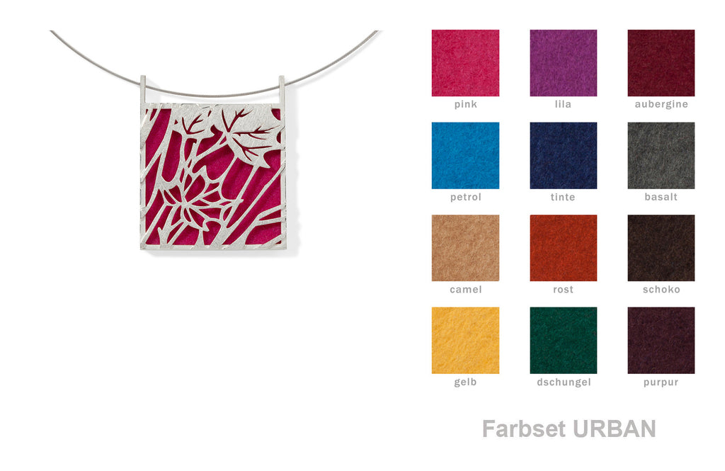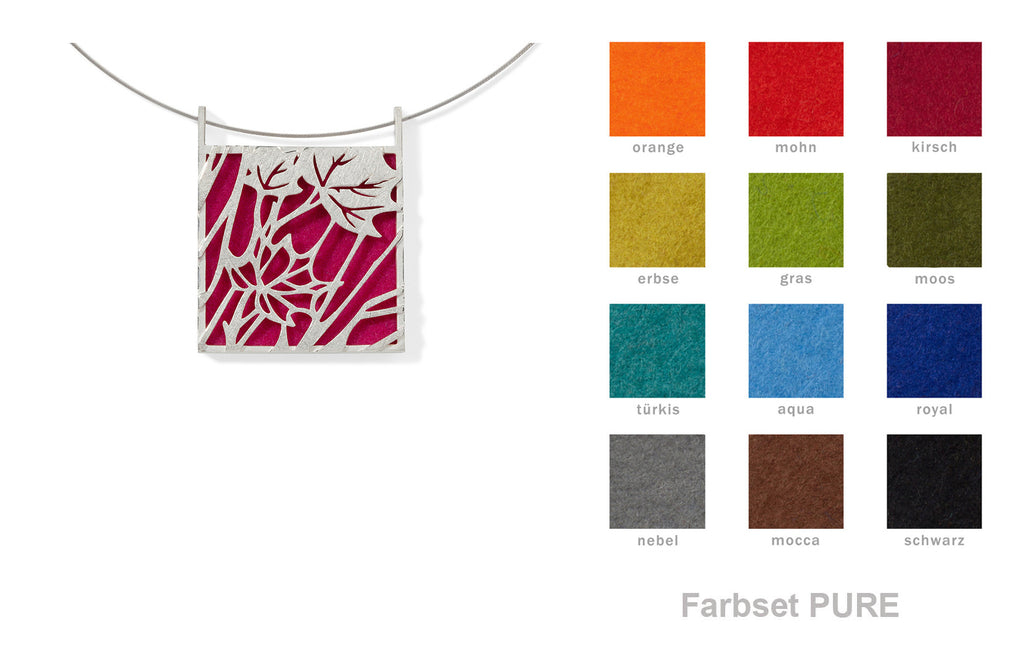 Dieser imposante Anhänger zeigt ein schönes Zusammenspiel von konstruktiver Strenge und floraler Leichtigkeit. Wie ein Scherenschnitt zeichnet sich die Silhouette der silbernen Blätter vor dem farbigen Untergrund ab. Ein wahres Multitalent ist dieses Schmuckstück: tragbar von beiden Seiten (Muster oder Farbe pur) und mit 12 Farben zum Auswechseln.